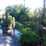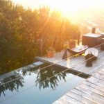 Piscina con horizonte infinito, gran terraza de 200 m2 de madera deck, en excelente estado de conservación y mantención. Jardines formados con riego por goteo, maceteros y barriles.